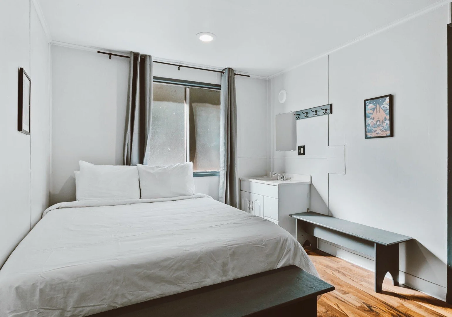 The lodge is located At the heart of base camp. Our welcoming lobby features mid-century furniture centered around a beautiful stone Fireplace.